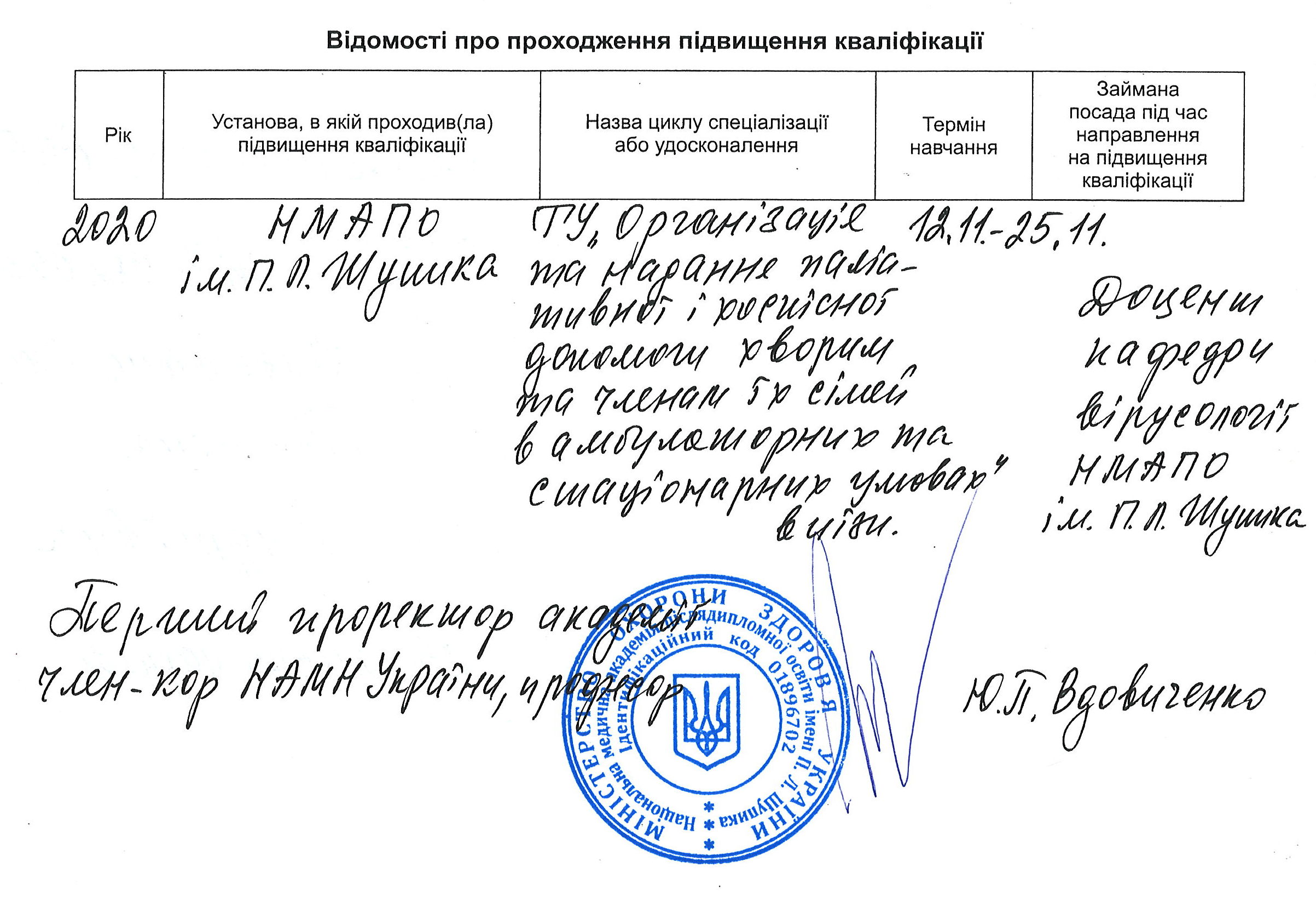 Professional activity. Until 2014, she worked in the management positions of the State Service of Social Diseases and the Ministry of Health of Ukraine, in international technical assistance projects in the field of HIV infection/AIDS. From 2015 to now at the National University named after P. L. Shupyk.